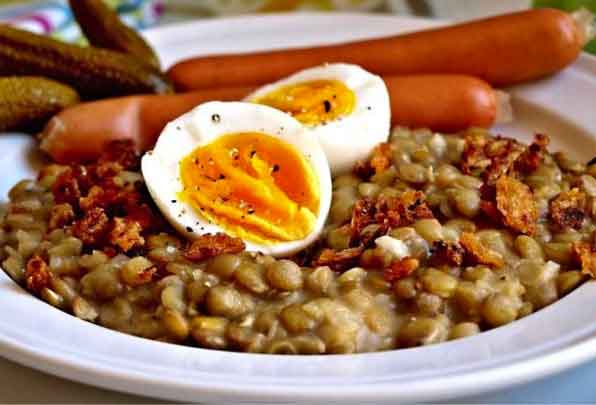 6. Scoop the lentils on a plate. Sprinkle with fried onions, add an egg, and possibly sausage.